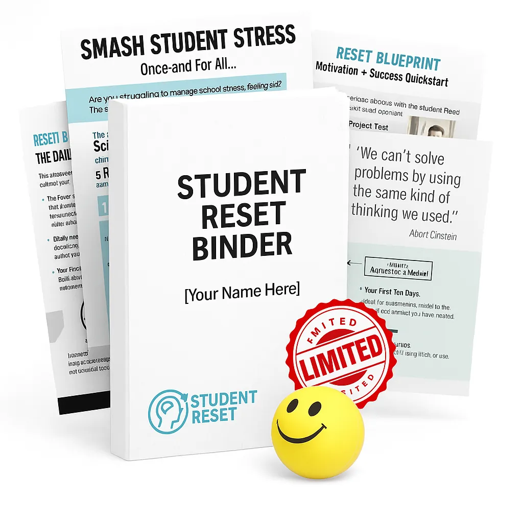Yep — no catch. We print, assemble, and package your Student Reset Binder and include the bonus materials entirely at our cost. You just cover the small shipping and sales tax fee so we can get it to your door. It’s our way of getting this system into the hands of as many stressed-out students as possible.